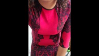Wearing a red dress and playing with my tight hairy squirting pussy